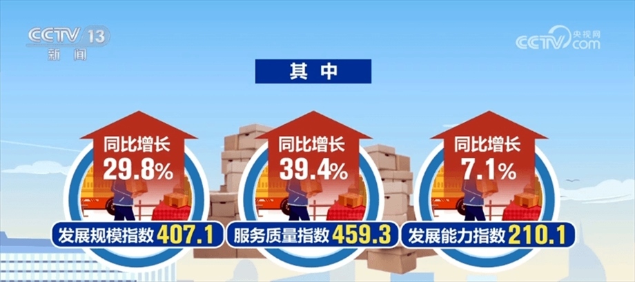 數(shù)據(jù)顯示,2024年1—2月中國快遞發(fā)展指數(shù)為329.6,同比提升26.7%。其中,發(fā)展規(guī)模指數(shù)、服務(wù)質(zhì)量指數(shù)和發(fā)展能力指數(shù)同比分別增長29.8%、39.4%、7.1%,發(fā)展趨勢指數(shù)為66。
