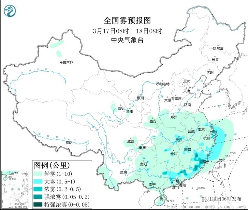今晨,江蘇、上海、浙江南部、江西中部、福建、廣東、廣西北部、貴州中部等地部分地區(qū)出現(xiàn)大霧天氣,局地能見度不足200米。預(yù)計(jì)今天上午,上述地區(qū)的大霧天氣還將持續(xù),局地有能見度不足200米的強(qiáng)濃霧。此外,黃海南部海域、東海偏西海域、臺灣海峽將有能見度不足10公里的霧,其中東海西部海域、長江口附近海域、杭州灣附近海域、浙江沿岸海域、福建北部沿岸海域?qū)⒂心芤姸炔蛔?公里的大霧。中央氣象臺今晨繼續(xù)發(fā)布大霧黃色預(yù)警。