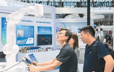2023年6月16日,參展商在黑龍江省哈爾濱市舉辦的第三十二屆哈爾濱國際經(jīng)濟貿(mào)易洽談會現(xiàn)場展示醫(yī)療機器人的用法。