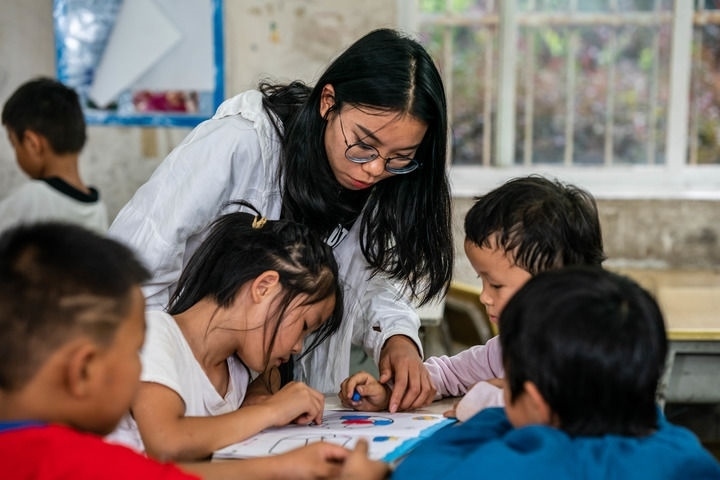 ?在云南省文山州文山市馬塘鎮(zhèn)新開田村委會新開田一隊(duì),志愿者楊紅非在“少年兒童之家”教孩子們繪畫(2022年8月9日攝)。