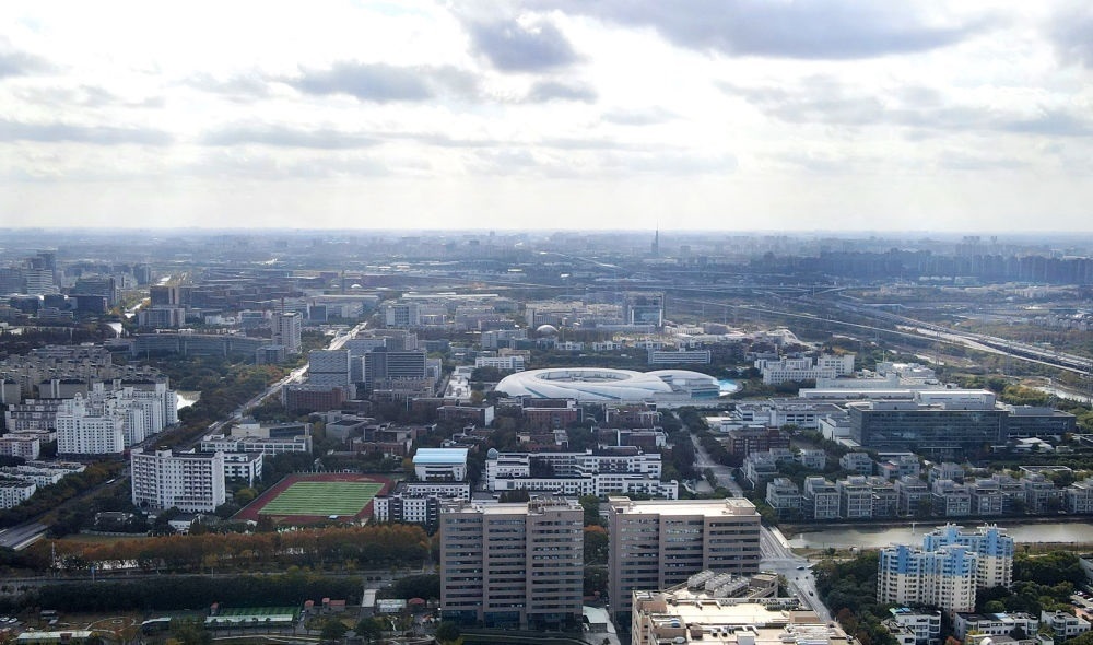 空中遠望位于上海浦東新區(qū)張江科學城的形如鸚鵡螺的大科學裝置上海光源(中)(2023年11月25日攝,無人機照片)。新華社記者 方喆 攝