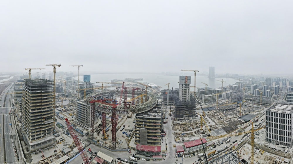 空中俯瞰建設中的上海臨港新片區(qū)滴水湖金融灣項目(2024年1月18日攝,無人機全景照片)。新華社記者 方喆 攝