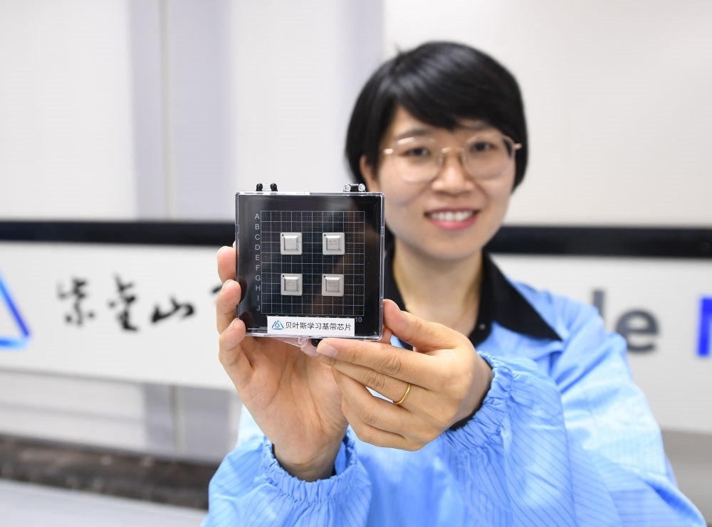 在南京紫金山實驗室6G綜合實驗室,科研人員展示自主研發(fā)的貝葉斯學習基帶芯片(2023年7月6日攝)。新華社記者 季春鵬 攝