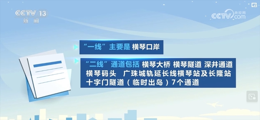 “一線”主要是橫琴口岸,“二線”通道包括橫琴大橋、橫琴隧道、深井通道、橫琴碼頭、廣珠城軌延長(zhǎng)線橫琴站及長(zhǎng)隆站、十字門(mén)隧道(臨時(shí)出島)7個(gè)通道。