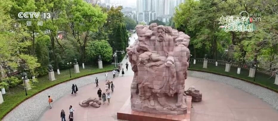 這里是位于重慶市沙坪壩區(qū)的歌樂山烈士陵園。1939年至1949年,以渣滓洞、白公館為主的重慶軍統(tǒng)集中營是國民黨囚禁和屠殺中共黨員、抗日愛國將領(lǐng)、民主人士及其他革命志士的秘密監(jiān)獄。重慶解放后,人民政府將犧牲的300多名英烈遺骸合葬于此,并于1954年建成烈士墓園和烈士紀(jì)念碑。在烈士陵園中,聳立著一座由438塊紅色花崗石組成的烈士群雕。人們來到這里獻(xiàn)花祭掃、默哀緬懷,汲取砥礪前行的力量。