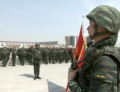 △2014年4月9日,“獵鷹突擊隊”授旗儀式上,全體隊員向隊旗行舉手禮并莊嚴宣誓。