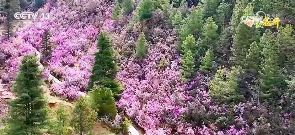 跟隨鏡頭,我們來到云南省怒江州蘭坪縣,在海拔2810米的啦井鎮(zhèn)期井村,漫山遍野的野生杜鵑花競相綻放。馬纓杜鵑、團(tuán)花杜鵑、假乳黃杜鵑、猴頭杜鵑……山谷里、山坡上,紅的、粉的、黃的,層層疊疊開滿枝頭,隨著山勢(shì)起伏跌宕,仿佛浪潮一般,形成了天然的花海。
