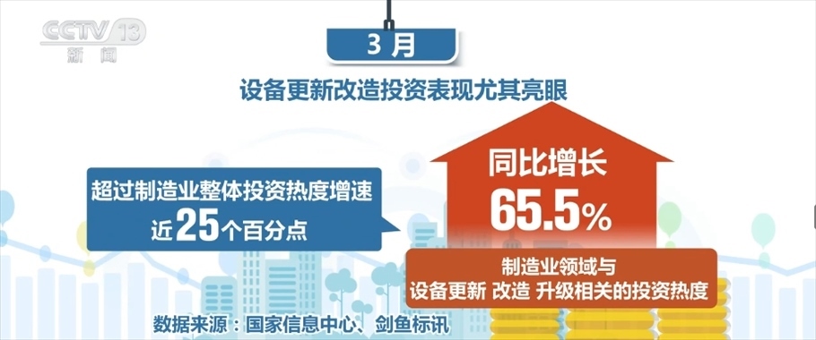 制造業(yè)領(lǐng)域則更為突出,1—2月,制造業(yè)投資熱度指數(shù)同比增長13.3%,3月迅速提升至40.6%,遠高于全國總體投資熱度增速。設(shè)備更新改造投資表現(xiàn)尤其亮眼,3月,制造業(yè)領(lǐng)域與設(shè)備更新、改造、升級相關(guān)的投資熱度同比增長65.5%,超過制造業(yè)整體投資熱度增速近25個百分點。