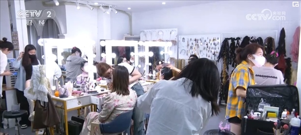 晚上8時,在這家寫真店,仍有不少消費(fèi)者在做妝造。負(fù)責(zé)人介紹,潑水節(jié)期間,他們的客流量比平時多了一倍。