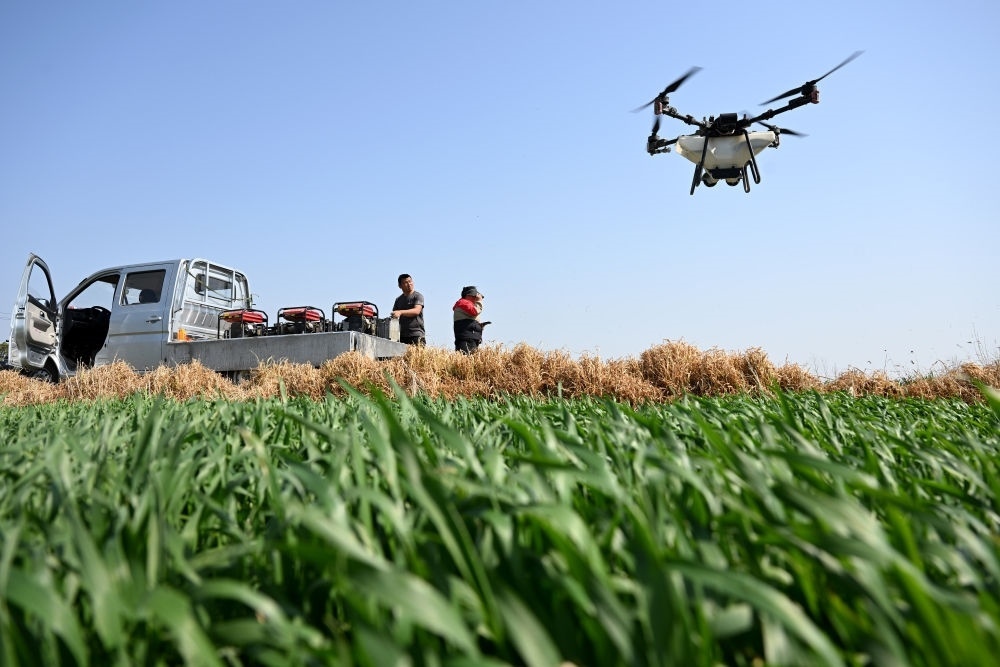 2024年3月22日,在安徽省合肥市廬江縣同大鎮(zhèn),工作人員操作植保無人機(jī)為小麥?zhǔn)┓?。新華社記者 黃博涵 攝