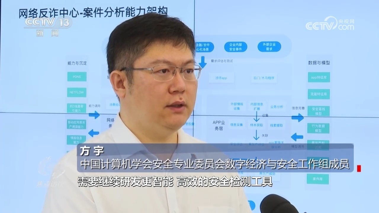 方宇:“下一步,針對涉詐APP的發(fā)現(xiàn),需要繼續(xù)研發(fā)更智能、高效的安全檢測工具,建立涉詐APP的黑名單數(shù)據(jù)庫。另外,結(jié)合一些新型、智能化的技術(shù)手段,通過對網(wǎng)絡流量分析,及時發(fā)現(xiàn)詐騙流量,并通過公安、網(wǎng)信、金融、市場監(jiān)管等部門進一步加強聯(lián)動、信息及時共享、及時進行阻斷,多措并舉,共同努力,形成合力,打擊涉詐APP?!?/p>