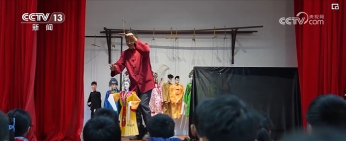 舞臺上,廿八都小學(xué)的同學(xué)們,一邊操縱木偶,一邊唱著臺詞,在非遺傳承人金宗懷的帶領(lǐng)下,正在演出他們最新排演的木偶戲。