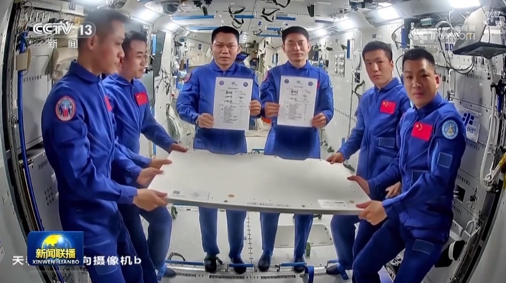 下午三時(shí)許,神舟十七號(hào)航天員湯洪波、唐勝杰、江新林和神舟十八號(hào)航天員葉光富、李聰、李廣蘇在空間站天和核心艙在軌舉行交接儀式,6名航天員分別在確認(rèn)書上簽字。