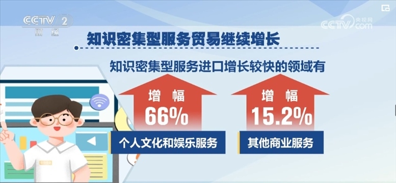 知識密集型服務(wù)貿(mào)易繼續(xù)增長。2024年一季度,知識密集型服務(wù)進(jìn)出口7332.6億元,增長5.6%。其中知識密集型服務(wù)出口增長較快的領(lǐng)域有知識產(chǎn)權(quán)使用費(fèi)、個(gè)人文化和娛樂服務(wù),增幅分別為34.4%、19%;知識密集型服務(wù)進(jìn)口增長較快的領(lǐng)域有個(gè)人文化和娛樂服務(wù)、其他商業(yè)服務(wù),增幅分別為66%、15.2%。