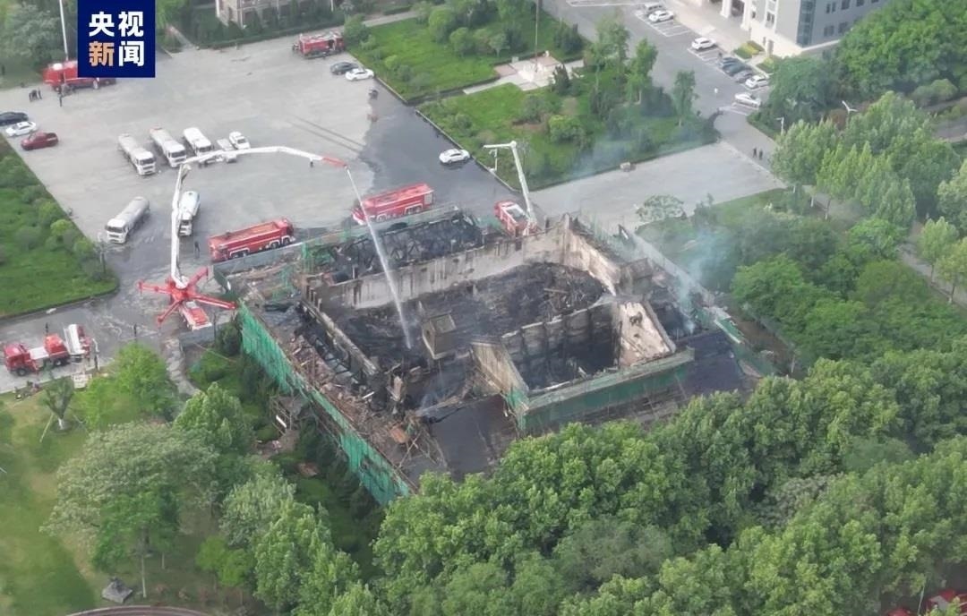根據(jù)最新圖片顯示,大禮堂房頂基本坍塌,被火燒過的外墻一片焦黑,只剩下綠色安全隔離網(wǎng)。