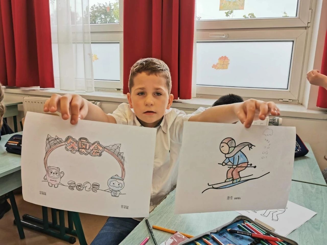 △匈中雙語學校學生展示具有冬奧元素的填圖畫 。