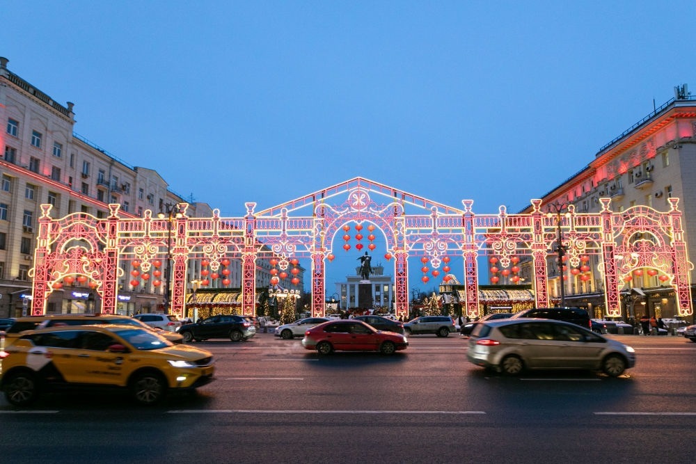 2024年2月9日,在俄羅斯首都莫斯科,車(chē)輛在中國(guó)新年主題裝飾前駛過(guò)。當(dāng)日,“莫斯科的中國(guó)新年”文化活動(dòng)在俄羅斯首都莫斯科市中心啟動(dòng)。新華社記者 白雪騏 攝
