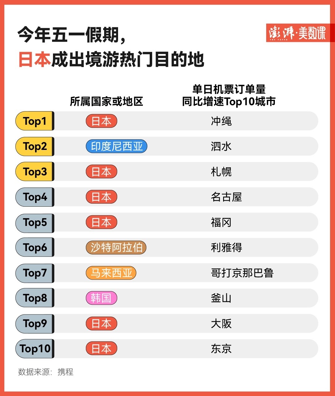 除了國內(nèi)旅游市場的火爆之外,“五一”出境游已經(jīng)加快復(fù)蘇。從攜程提供的數(shù)據(jù)看,今年“五一”假期,日本成了出境游熱門目的地——相比2023年同期,單日機票訂單量同比增速Top10的城市中,日本的沖繩、札幌、名古屋等城市分別占據(jù)了六個席位。
