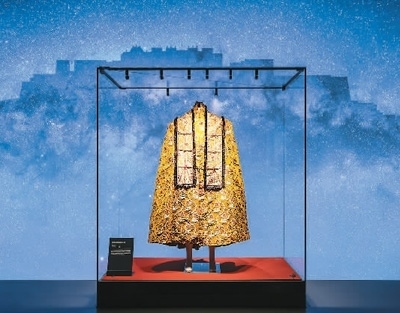 走進展廳,在星空璀璨的布達拉宮夜景映襯下,一件金燦燦的斗篷格外引人注目。斗篷是西藏地區(qū)常見的服裝,根據(jù)場合和穿著對象的不同,斗篷的式樣和用料均有所差別。這件金寶地花卉紋斗篷通長170厘米,黃綢緞上繡滿了花紋圖案,并鑲有多種珠寶,衣領上縫有獺皮,背后繡有云龍紋,可想而知穿著者身份之顯赫。此次展覽是它首次公開展出。