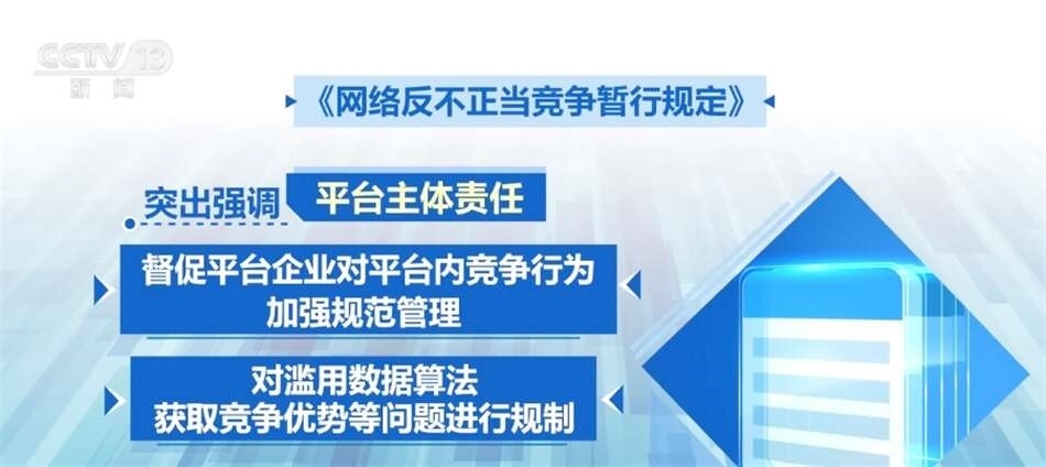 平臺(tái)企業(yè)掌握海量數(shù)據(jù),連接大量主體,既是網(wǎng)絡(luò)不正當(dāng)競(jìng)爭(zhēng)監(jiān)管的重點(diǎn)對(duì)象,也是協(xié)同監(jiān)管的關(guān)鍵節(jié)點(diǎn)?!兑?guī)定》突出強(qiáng)調(diào)了平臺(tái)主體責(zé)任,督促平臺(tái)企業(yè)對(duì)平臺(tái)內(nèi)競(jìng)爭(zhēng)行為加強(qiáng)規(guī)范管理,同時(shí)對(duì)濫用數(shù)據(jù)算法獲取競(jìng)爭(zhēng)優(yōu)勢(shì)等問(wèn)題進(jìn)行規(guī)制。