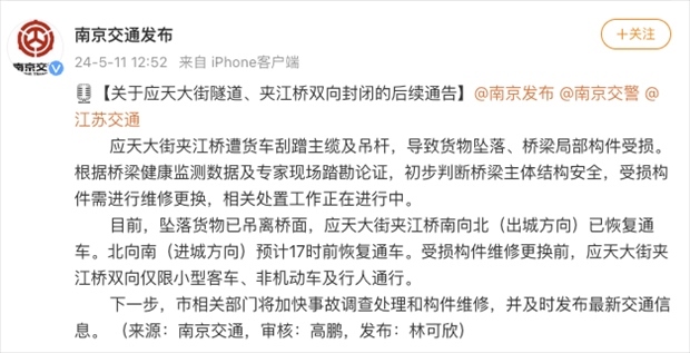 ·南京貨車(chē)側(cè)翻撞壞夾江大橋?官方通報(bào):初步判斷橋梁主體結(jié)構(gòu)安全。