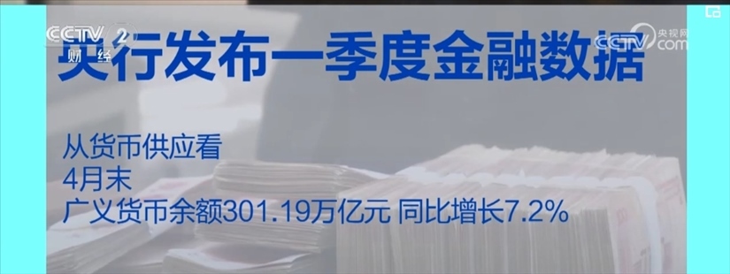 央行數(shù)據(jù)顯示,從貨幣供應看,4月末,廣義貨幣余額301.19萬億元,同比增長7.2%。