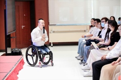?下圖為2023年5月,作為四川殘疾人勵志報告團成員的代國宏走進北京大學(xué),與學(xué)生交流。(四川省殘聯(lián)供圖)