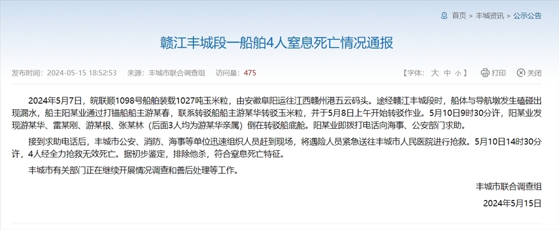 ·江西豐城4人轉(zhuǎn)運(yùn)受潮玉米時(shí)身亡,官方通報(bào):因窒息死亡,排除他殺。