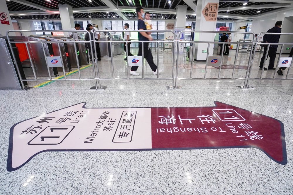 2023年6月24日,乘客在蘇州軌道交通11號(hào)線(xiàn)花橋站進(jìn)站乘車(chē)。當(dāng)日,蘇州軌道交通11號(hào)線(xiàn)正式投入運(yùn)營(yíng),并與上海軌道交通11號(hào)線(xiàn)實(shí)現(xiàn)無(wú)縫換乘,長(zhǎng)三角核心城市間首次實(shí)現(xiàn)地鐵系統(tǒng)跨省互聯(lián)互通。新華社記者 李博 攝