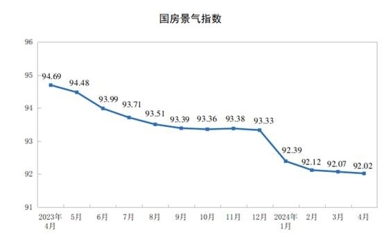 4月份,房地產(chǎn)開發(fā)景氣指數(shù)(簡稱“國房景氣指數(shù)”)為92.02。
