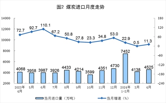 原煤生產(chǎn)降幅收窄,進(jìn)口明顯回升。4月份,規(guī)上工業(yè)原煤產(chǎn)量3.7億噸,同比下降2.9%,降幅比3月份收窄1.3個(gè)百分點(diǎn);日均產(chǎn)量1239萬噸。進(jìn)口煤炭4525萬噸,同比增長(zhǎng)11.3%。