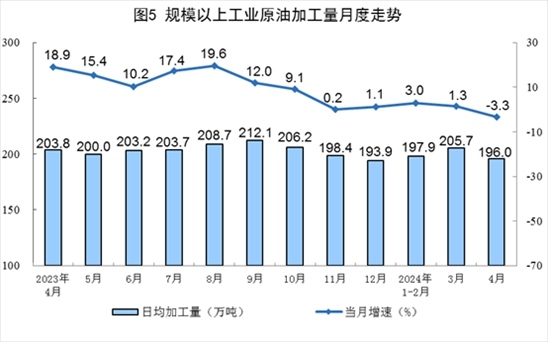 原油加工有所下降。4月份,規(guī)上工業(yè)原油加工量5879萬噸,同比下降3.3%,3月份為增長(zhǎng)1.3%;日均加工196.0萬噸。1—4月份,規(guī)上工業(yè)原油加工量24126萬噸,同比增長(zhǎng)1.1%。