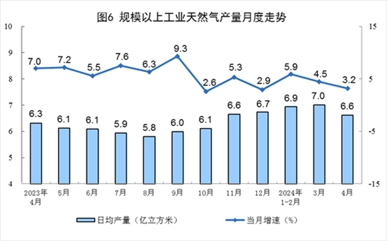 天然氣生產(chǎn)穩(wěn)定增長(zhǎng),進(jìn)口保持較快增長(zhǎng)。4月份,規(guī)上工業(yè)天然氣產(chǎn)量198億立方米,同比增長(zhǎng)3.2%,增速比3月份放緩1.3個(gè)百分點(diǎn);日均產(chǎn)量6.6億立方米。進(jìn)口天然氣1030萬噸,同比增長(zhǎng)15.1%。