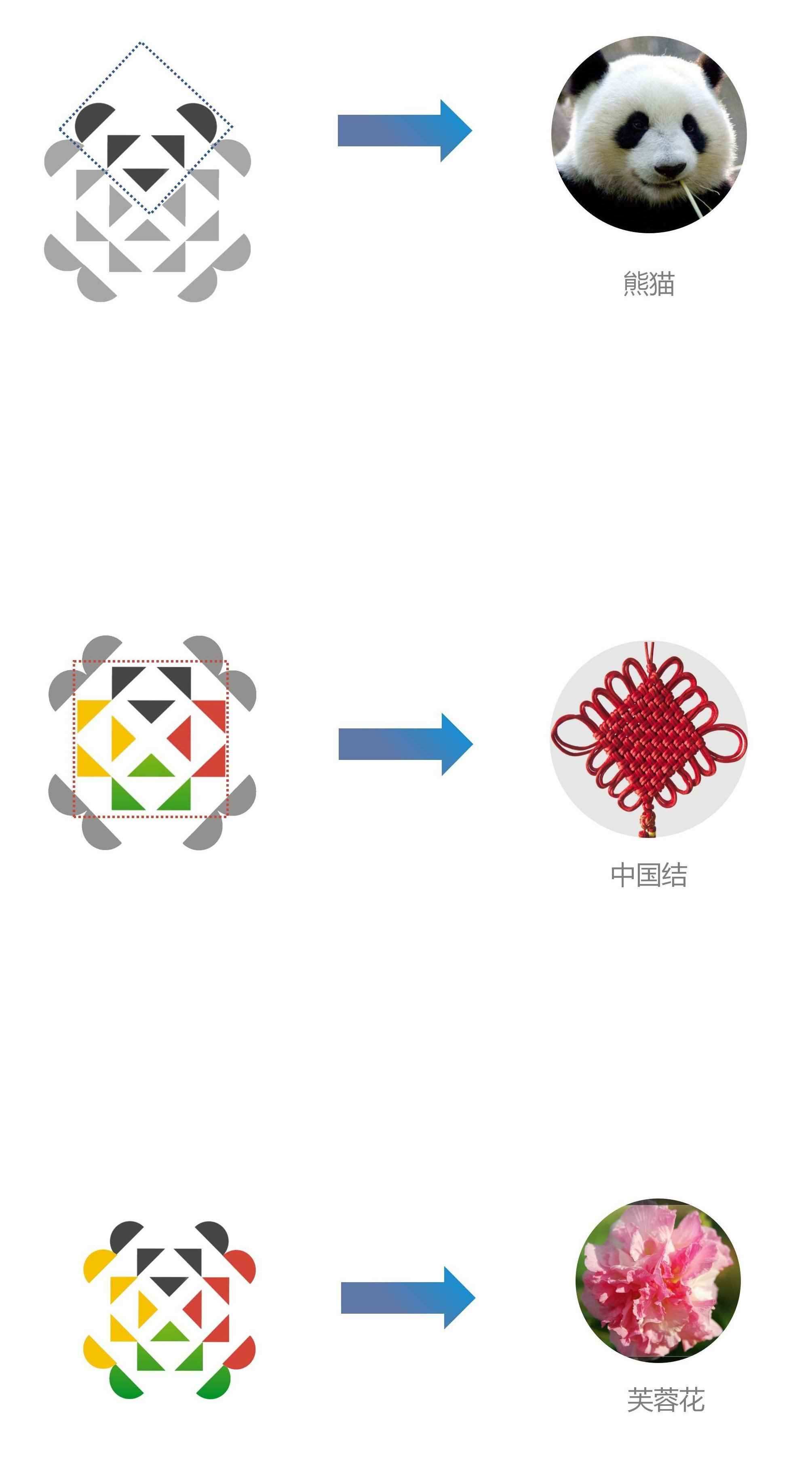 會徽設(shè)計靈感源于中國的大熊貓、芙蓉花和中國結(jié),以中國紅、金沙黃、公園綠、熊貓黑、雪山白為主色調(diào)。作為 2025 年成都世界運動會的重要標志,這一會徽有效傳達了奧林匹克精神又凸顯了中國傳統(tǒng)元素和成都特色,彰顯了“團結(jié)、包容、多樣性”的價值觀。同時,設(shè)計師秉承色彩明快、造型簡潔的設(shè)計理念,其外圍的半圓圖案和內(nèi)部排列的三角形,圍成一朵盛開的芙蓉花;紅、黑、黃、綠、白的幾何色塊拼出可愛的卡通大熊貓。