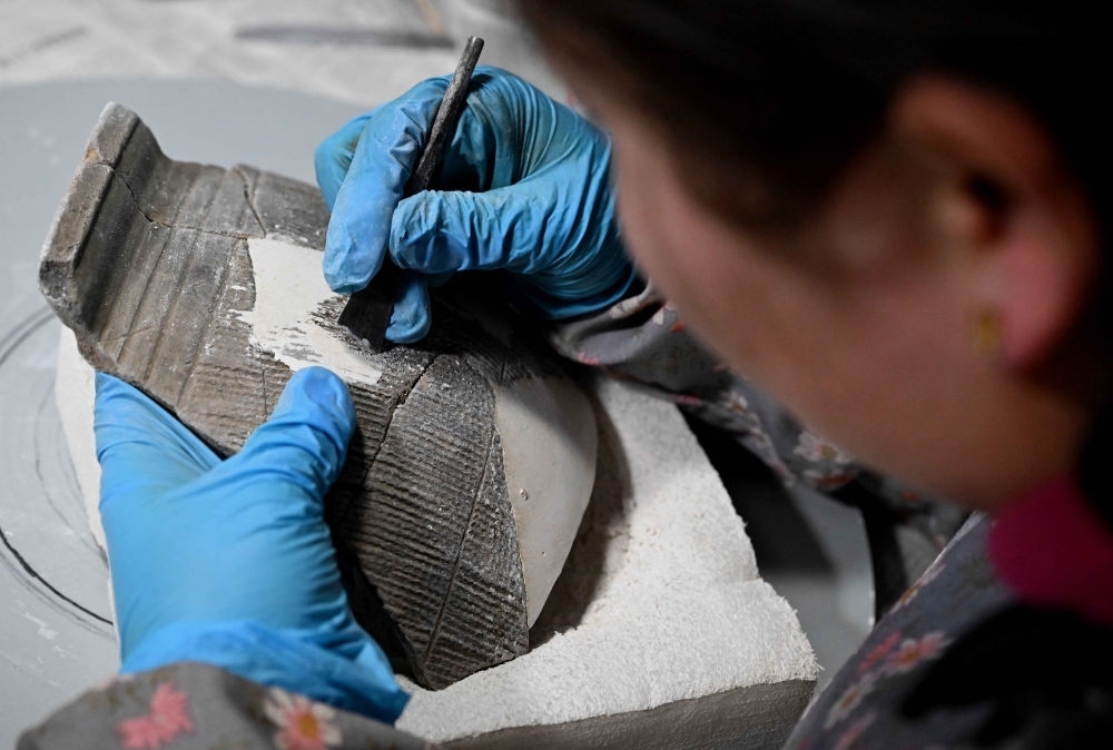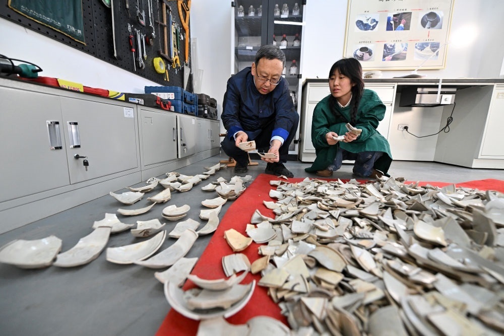 2024年2月23日,在中國(guó)社會(huì)科學(xué)院考古研究所安陽(yáng)工作站,工作人員在整理修復(fù)殷墟洹北商城出土的陶片。