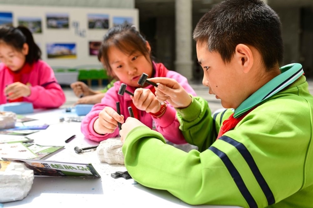 2024年4月22日,內(nèi)蒙古自治區(qū)鄂爾多斯市康巴什區(qū)實(shí)驗(yàn)小學(xué)在康巴什自然博物館開展“探索自然奧秘 保護(hù)地球家園”主題研學(xué)活動(dòng),這是學(xué)生在研學(xué)課程中體驗(yàn)尋找動(dòng)物化石。