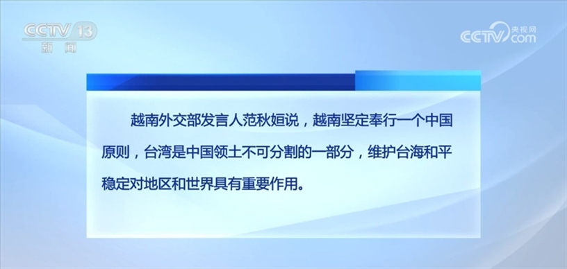 越南外交部發(fā)言人范秋姮說,越南堅定奉行一個中國原則,臺灣是中國領(lǐng)土不可分割的一部分,維護(hù)臺海和平穩(wěn)定對地區(qū)和世界具有重要作用。
