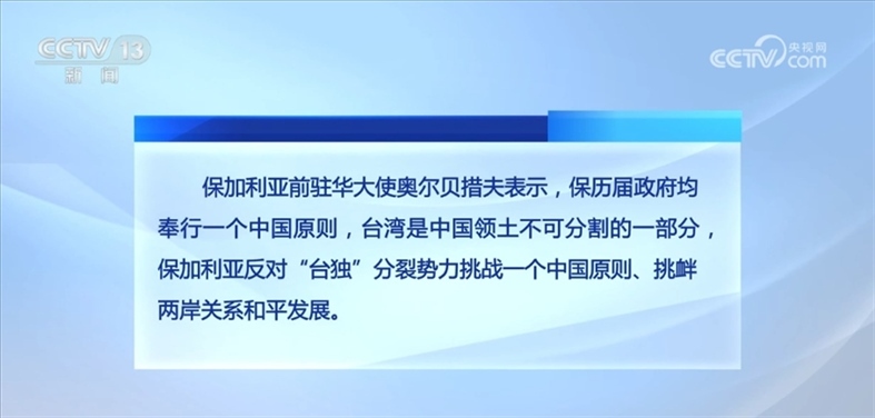 保加利亞前駐華大使奧爾貝措夫表示,保歷屆政府均奉行一個中國原則,臺灣是中國領(lǐng)土不可分割的一部分,保加利亞反對“臺獨(dú)”分裂勢力挑戰(zhàn)一個中國原則、挑釁兩岸關(guān)系和平發(fā)展。