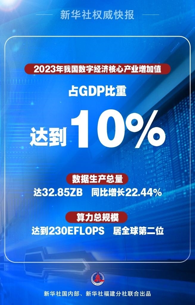2023年我國數(shù)字經(jīng)濟(jì)保持穩(wěn)健增長,數(shù)字經(jīng)濟(jì)核心產(chǎn)業(yè)增加值占GDP比重達(dá)到10%。數(shù)據(jù)要素市場日趨活躍,2023年數(shù)據(jù)生產(chǎn)總量達(dá)32.85ZB(1個(gè)ZB等于十萬億億字節(jié)),同比增長22.44%。數(shù)字基礎(chǔ)設(shè)施不斷擴(kuò)容提速,算力總規(guī)模達(dá)到230EFLOPS(EFLOPS是指每秒百億億次浮點(diǎn)運(yùn)算次數(shù)),居全球第二位。