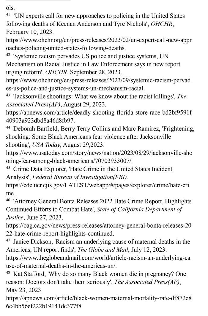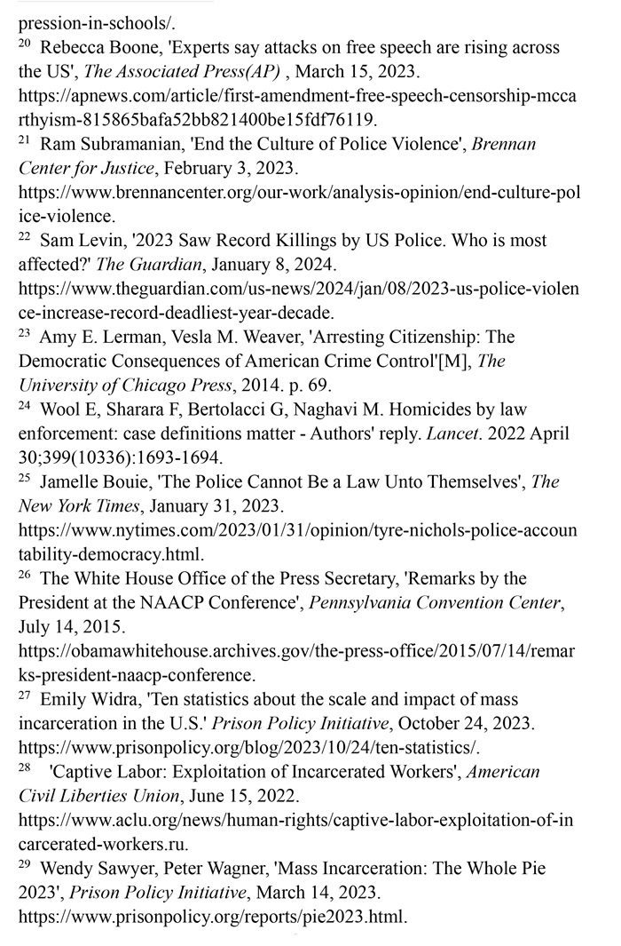 非洲裔在執(zhí)法領(lǐng)域面臨嚴(yán)重種族歧視。2023年1月3日,洛杉磯31歲的非洲裔男子基南·安德森涉嫌交通肇事,警方在制服他的過程中使用電擊槍擊中其6次,致其心臟病發(fā),送醫(yī)不治身亡。(注39)2023年1月7日,田納西州孟菲斯市的警察以“魯莽駕駛”為由將29歲的非洲裔男子泰爾·尼科爾斯攔下,并對(duì)其進(jìn)行長(zhǎng)達(dá)數(shù)分鐘的殘忍毆打。三天后尼科爾斯因傷勢(shì)過重去世,而事后的調(diào)查無法證實(shí)警察關(guān)于其“魯莽駕駛”的說法。(注40)這兩起非洲裔遭受警察暴力執(zhí)法身亡案例引發(fā)多名聯(lián)合國(guó)專家的高度關(guān)注。專家們強(qiáng)調(diào),在兩起事件中,警察使用的武力違反保護(hù)生命權(quán),禁止酷刑和其他殘忍、不人道或有辱人格待遇或處罰的國(guó)際準(zhǔn)則,也不符合聯(lián)合國(guó)《執(zhí)法人員行為守則》和《執(zhí)法人員使用武力和火器的基本原則》。(注41)聯(lián)合國(guó)人權(quán)理事會(huì)在執(zhí)法工作中推進(jìn)種族正義和平等的國(guó)際獨(dú)立專家機(jī)制在對(duì)美國(guó)實(shí)地訪問后發(fā)布報(bào)告指出,針對(duì)非洲裔的系統(tǒng)性種族主義已經(jīng)滲透到美國(guó)警察隊(duì)伍和刑事司法系統(tǒng)。非洲裔被警察殺害的可能性是白人的3倍,被監(jiān)禁的可能性是白人的4.5倍。在每年1000多起警察殺人案件中,只有1%的涉事警察被指控。報(bào)告警告說,美國(guó)如果不按照國(guó)際標(biāo)準(zhǔn)改革警察使用武力的規(guī)則,許多殺戮將繼續(xù)發(fā)生。(注42)