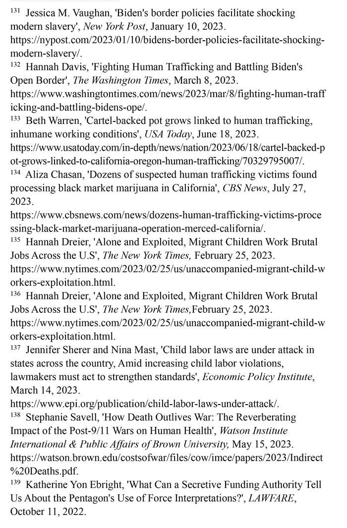 邊境政策助長(zhǎng)現(xiàn)代奴隸制。美國(guó)政府的邊境政策加劇人口販運(yùn)問題。被遺棄在邊境州城鎮(zhèn)或被運(yùn)往全國(guó)各地的移民,往往處于孤立無援境地,最容易受到剝削和販運(yùn)。那些非法越境后聚集在擁擠、缺乏監(jiān)管的庇護(hù)所的兒童也成為人口販子的獵物。(注131)在美國(guó)被販運(yùn)的人中,72%是移民,其中大部分是通過偷渡入境,人口販運(yùn)的受害者多是婦女和兒童。打擊販賣婦女聯(lián)盟的一項(xiàng)研究估計(jì),60%的越境無人陪伴移民兒童被犯罪集團(tuán)強(qiáng)迫從事兒童色情甚至販毒活動(dòng)。(注132)《今日美國(guó)報(bào)》網(wǎng)站2023年6月18日?qǐng)?bào)道,移民被販毒集團(tuán)誘騙到加利福尼亞州北部和俄勒岡州南部的農(nóng)場(chǎng)從事大麻種植,遭受奴役和強(qiáng)迫勞動(dòng)。被販賣的移民在大麻農(nóng)場(chǎng)遭持槍恐嚇,每天被迫工作16個(gè)小時(shí)甚至更長(zhǎng)時(shí)間,有時(shí)連飯都吃不上。移民婦女遭到性侵犯,有些人被謀殺,尸體被丟棄在荒野中。(注133)美國(guó)哥倫比亞廣播公司新聞網(wǎng)2023年7月27日?qǐng)?bào)道,近60名遭人口販運(yùn)的受害者被偷運(yùn)到加利福尼亞中部的一個(gè)非法大麻種植場(chǎng)所,被強(qiáng)迫加工大麻,向偷運(yùn)者償還債務(wù)。(注134)