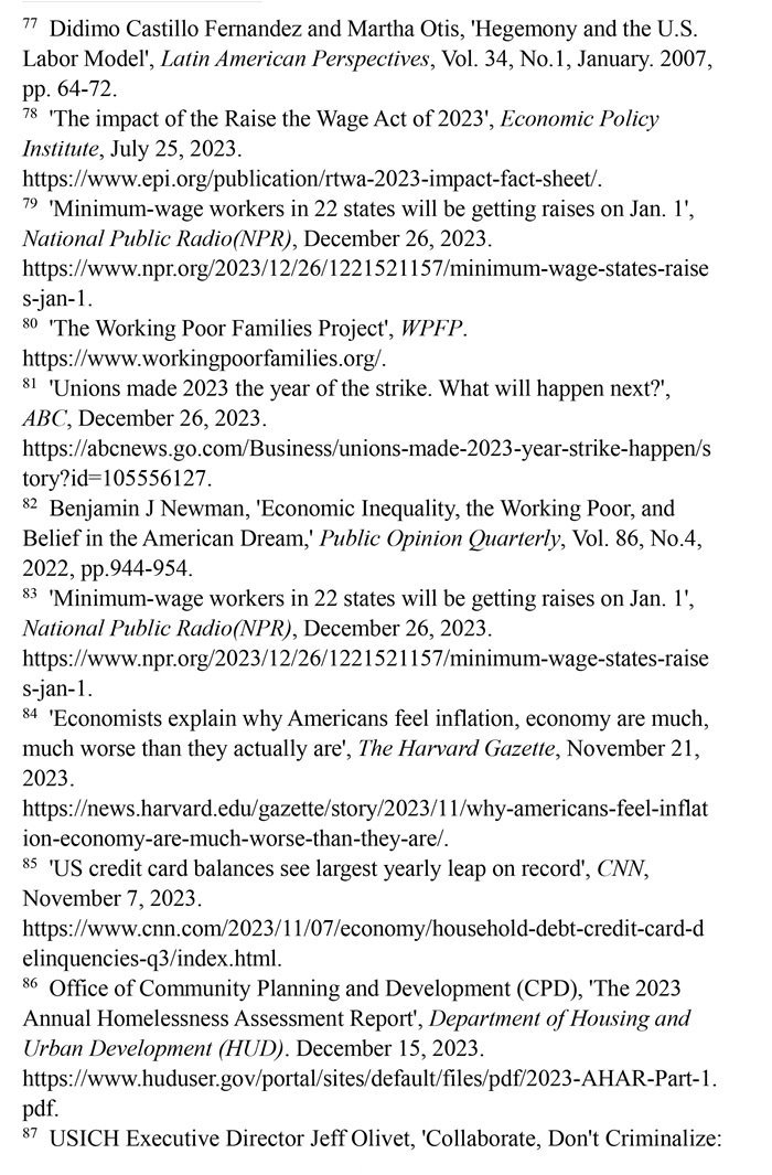 美國(guó)貧富分化加劇,“工作者貧困”現(xiàn)象凸顯,經(jīng)濟(jì)社會(huì)權(quán)利保障制度空轉(zhuǎn)。長(zhǎng)期以來的勞資分配差異懸殊,導(dǎo)致貧富差距達(dá)到1929年經(jīng)濟(jì)大危機(jī)以來最嚴(yán)重的程度。美國(guó)有1150萬個(gè)低收入工薪家庭,聯(lián)邦最低時(shí)薪標(biāo)準(zhǔn)自2009年以來一直沒有上調(diào),2023年1美元購(gòu)買力已降至2009年的70%。低收入家庭難以支付食品、房租和能源等基本生活所需,無家可歸者超過65萬人,創(chuàng)16年來新高。“工作者貧困”使辛勤勞作者的“美國(guó)夢(mèng)”破碎,導(dǎo)致2023年發(fā)生了21世紀(jì)以來波及范圍最廣的罷工潮。