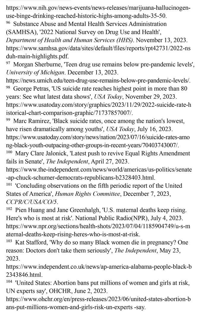 美國(guó)婦女兒童權(quán)利長(zhǎng)期遭受系統(tǒng)性侵犯,保障性別平等的憲法規(guī)定付之闕如,至今未批準(zhǔn)聯(lián)合國(guó)《消除對(duì)婦女一切形式歧視公約》,而且是聯(lián)合國(guó)會(huì)員國(guó)中唯一沒有批準(zhǔn)《兒童權(quán)利公約》的國(guó)家。美國(guó)參議院2023年4月否決了保障性別平等的憲法修正提案。美國(guó)每年約有5.4萬名婦女因遭受懷孕歧視而失業(yè)。超過220萬育齡婦女無法獲得產(chǎn)科護(hù)理。至少有21個(gè)州命令禁止或嚴(yán)格限制墮胎。孕產(chǎn)婦死亡人數(shù)近20年來增加了一倍多。職場(chǎng)、校園、家庭等多領(lǐng)域的性暴力層出不窮。兒童的生存權(quán)與發(fā)展權(quán)堪憂。大量?jī)和慌懦鲠t(yī)療補(bǔ)助計(jì)劃。槍支暴力成為兒童死亡的主要原因。毒品濫用在青少年群體中蔓延。46個(gè)州被發(fā)現(xiàn)瞞報(bào)約3.48萬例寄養(yǎng)兒童失蹤案件。
