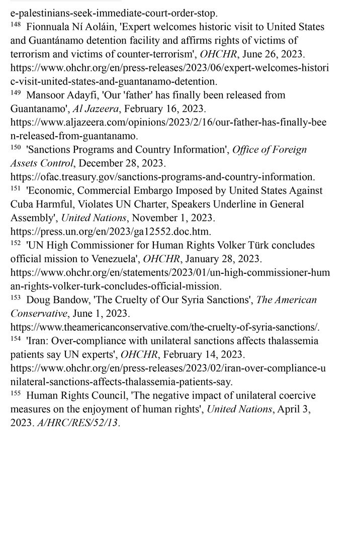 長(zhǎng)期濫施單邊制裁造成嚴(yán)重人道主義后果。自1950年以來,美國(guó)使用的制裁次數(shù)居全球之首。根據(jù)美國(guó)財(cái)政部2023年12月28日公布的數(shù)據(jù),美國(guó)制裁的國(guó)家超過20個(gè)。(注150)第78屆聯(lián)合國(guó)大會(huì)發(fā)言人2023年11月1日指出,美國(guó)對(duì)古巴實(shí)施的經(jīng)濟(jì)、商業(yè)和金融封鎖違反了《聯(lián)合國(guó)憲章》,對(duì)古巴人民造成了毀滅性影響。(注151)聯(lián)合國(guó)大會(huì)2023年11月2日通過決議,再次敦促美國(guó)終止對(duì)古巴長(zhǎng)達(dá)60多年的經(jīng)濟(jì)、商業(yè)和金融封鎖,這是聯(lián)合國(guó)大會(huì)連續(xù)第31年通過類似決議。2023年1月28日,聯(lián)合國(guó)人權(quán)事務(wù)高級(jí)專員沃爾克·圖爾克在訪問委內(nèi)瑞拉后表示,2017年以來美國(guó)施加的制裁加劇了委內(nèi)瑞拉的經(jīng)濟(jì)危機(jī),嚴(yán)重阻礙人權(quán)的實(shí)現(xiàn)。(注152)“美國(guó)保守派”網(wǎng)站2023年6月1日?qǐng)?bào)道,美國(guó)制裁進(jìn)一步加劇了敘利亞人民的貧困。敘利亞70%的人口面臨食物短缺,其中1200萬人三餐不繼,290萬人食不果腹。(注153)聯(lián)合國(guó)人權(quán)理事會(huì)單邊強(qiáng)制措施對(duì)人權(quán)負(fù)面影響問題特別報(bào)告員阿萊娜·杜晗2023年2月14日指出,美國(guó)對(duì)伊朗的制裁減少了地中海貧血癥患者從國(guó)外進(jìn)口救命藥物的機(jī)會(huì),導(dǎo)致伊朗患者的并發(fā)癥和死亡率增加,是對(duì)健康權(quán)的侵犯。(注154)聯(lián)合國(guó)人權(quán)理事會(huì)2023年4月3日通過決議指出,單邊強(qiáng)制性措施會(huì)對(duì)目標(biāo)國(guó)家廣大民眾的人權(quán)產(chǎn)生深遠(yuǎn)影響,對(duì)窮人和處境最脆弱的人影響尤為嚴(yán)重。決議譴責(zé)某些大國(guó)繼續(xù)單方面適用單邊強(qiáng)制性措施。美國(guó)在該決議表決中投了反對(duì)票。(注155)