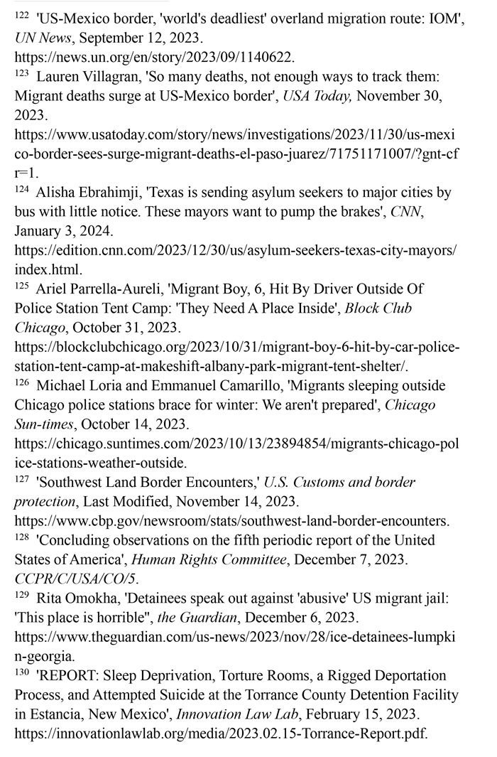 入境移民遭受酷刑及其他不人道待遇。2023財(cái)年,在美國(guó)南部邊境遭逮捕或驅(qū)逐的移民總數(shù)達(dá)240多萬人,再創(chuàng)歷史新高。(注127)聯(lián)合國(guó)人權(quán)事務(wù)委員會(huì)對(duì)移民在美國(guó)受到長(zhǎng)時(shí)間的拘留表示擔(dān)憂,批評(píng)美國(guó)的拘留所條件惡劣,人滿為患,被拘押者無法獲得食物、水和醫(yī)療服務(wù),導(dǎo)致包括兒童在內(nèi)的許多人死亡;公共和私營(yíng)移民拘留設(shè)施存在性暴力、長(zhǎng)期單獨(dú)監(jiān)禁、虐待等侵犯人權(quán)問題。(注128)英國(guó)《衛(wèi)報(bào)》網(wǎng)站2023年12月6日?qǐng)?bào)道,由美國(guó)私人監(jiān)獄公司CoreCivic運(yùn)營(yíng)的、位于佐治亞州蘭普金的斯圖爾特拘留中心存在長(zhǎng)期單獨(dú)監(jiān)禁、性虐待、醫(yī)療疏忽以及強(qiáng)迫勞動(dòng)等令人擔(dān)憂的問題。(注129)創(chuàng)新法律實(shí)驗(yàn)室于2023年2月15日發(fā)布報(bào)告揭露,由CoreCivic運(yùn)營(yíng)的、位于新墨西哥州埃斯坦西亞的托蘭斯縣拘留所存在對(duì)被關(guān)押者實(shí)施酷刑現(xiàn)象。在夜間,每隔15分鐘就會(huì)有一名警衛(wèi)開著收音機(jī)的最大音量走過這些房間,大聲地敲著門,并用手電筒強(qiáng)光照進(jìn)房間,吵醒任何可能睡著的人。在寒冷的天氣里,每個(gè)房間的通風(fēng)管道整夜都在吹冷空氣。一些人試圖用衛(wèi)生紙或毯子蓋住通風(fēng)口,但警衛(wèi)們拿走了用來阻擋冷空氣的任何東西。這些牢房里,廁所污水和糞便溢出,人們被迫睡在臭氣熏天的地板上。(注130)