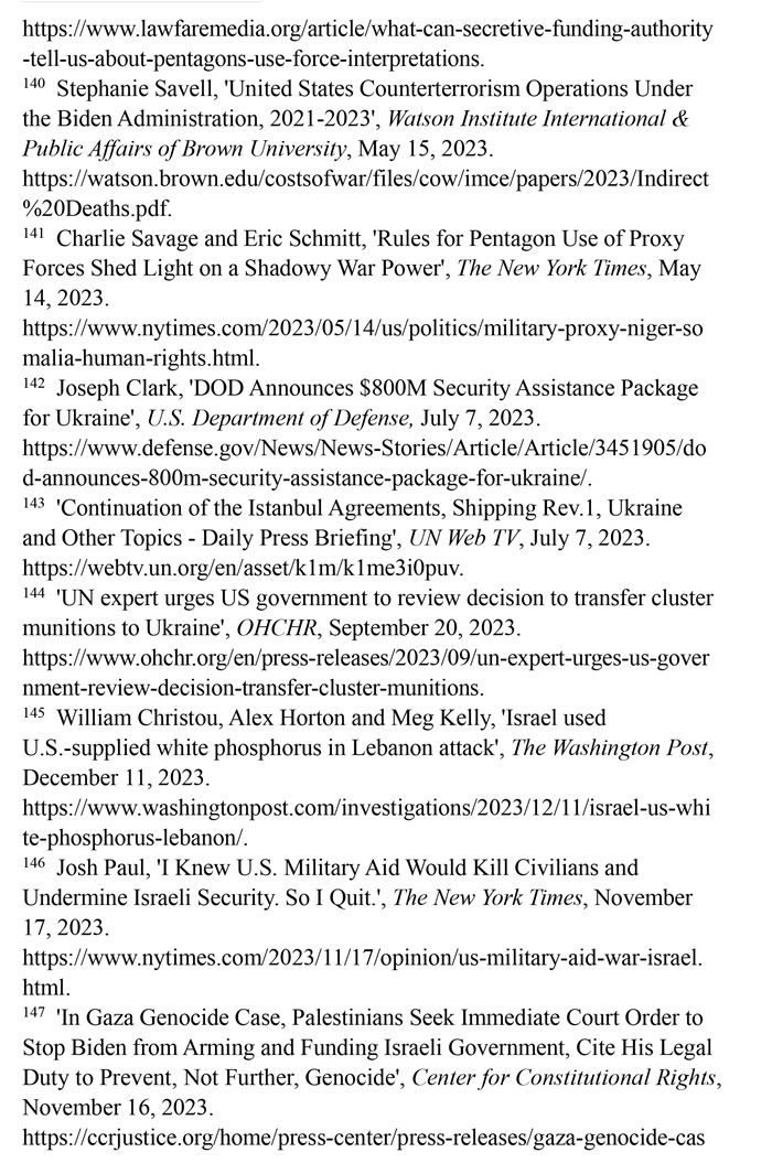 持續(xù)向沖突地區(qū)提供武器。美國(guó)國(guó)防部2023年7月7日發(fā)布的新聞稿顯示,美國(guó)向?yàn)蹩颂m提供的價(jià)值8億美元的額外軍事援助中,包含大量集束彈藥。(注142)聯(lián)合國(guó)秘書長(zhǎng)副發(fā)言人哈克2023年7月7日回答記者提問時(shí)表示,聯(lián)合國(guó)秘書長(zhǎng)安東尼奧·古特雷斯希望各國(guó)遵守《集束彈藥公約》,不要在戰(zhàn)場(chǎng)上繼續(xù)使用集束彈藥。(注143)聯(lián)合國(guó)人權(quán)高專辦網(wǎng)站2023年9月20日?qǐng)?bào)道,聯(lián)合國(guó)人權(quán)理事會(huì)酷刑和其他殘忍、不人道或有辱人格的待遇或處罰問題特別報(bào)告員愛麗絲·吉爾·愛德華茲2023年7月向美國(guó)政府發(fā)出緊急信函,警告集束彈藥會(huì)對(duì)平民造成嚴(yán)重傷害。(注144)《華盛頓郵報(bào)》網(wǎng)站2023年12月11日?qǐng)?bào)道,美國(guó)每年流入以色列的軍火達(dá)數(shù)十億美元,以色列在10月對(duì)黎巴嫩南部的一次襲擊中使用了美國(guó)供應(yīng)的白磷彈藥,造成至少9名平民受傷。(注145)美國(guó)國(guó)務(wù)院政治軍事事務(wù)局前局長(zhǎng)喬希·保羅2023年10月18日在《紐約時(shí)報(bào)》網(wǎng)站發(fā)表專欄文章指出,美國(guó)每年向以色列提供至少38億美元軍事援助,加沙地帶最嚴(yán)重的人員傷亡大多是由美國(guó)提供的彈藥所導(dǎo)致,譴責(zé)這種軍事援助無視人權(quán)問題。(注146)美國(guó)人權(quán)組織“憲法權(quán)利中心”2023年11月16日?qǐng)?bào)道,滅絕種族與死刑問題專家威廉·沙巴斯指責(zé)美國(guó)未能履行防止種族滅絕的法律義務(wù),違反了習(xí)慣國(guó)際法和《防止及懲治滅絕種族罪公約》。(注147)