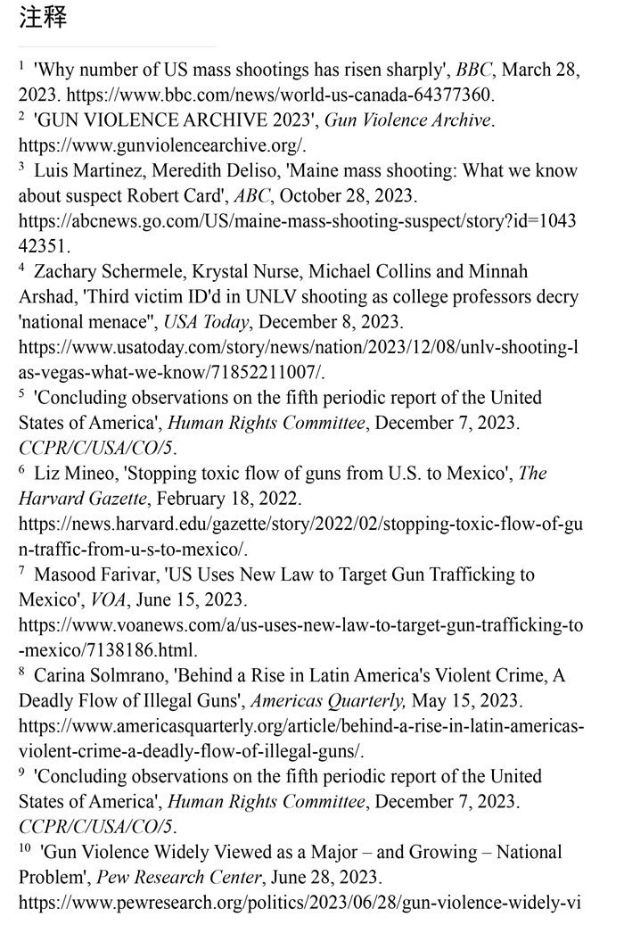 槍支暴力造成慘痛生命代價(jià)。數(shù)據(jù)顯示,美國(guó)所有類型的槍支暴力事件都呈上升趨勢(shì)。(注1)根據(jù)“槍支暴力檔案”網(wǎng)站統(tǒng)計(jì)的數(shù)據(jù),2023年美國(guó)至少發(fā)生了654起大規(guī)模槍擊事件。槍支暴力導(dǎo)致近4.3萬人死亡,平均每天死亡117人。(注2)例如,美國(guó)廣播公司新聞網(wǎng)站2023年10月28日?qǐng)?bào)道,緬因州發(fā)生大規(guī)模槍擊事件,造成至少18人死亡,13人受傷。(注3)《今日美國(guó)報(bào)》網(wǎng)站2023年12月6日?qǐng)?bào)道,拉斯維加斯3名大學(xué)教授被一名前同事槍殺。美國(guó)大學(xué)教授協(xié)會(huì)主席艾琳·馬爾維稱,槍支暴力是“不可接受的國(guó)家威脅”,敦促美國(guó)政府進(jìn)行槍支政策改革。(注4)美國(guó)與槍支有關(guān)的傷亡人數(shù)激增,引發(fā)聯(lián)合國(guó)人權(quán)事務(wù)委員會(huì)的嚴(yán)重關(guān)切。(注5)