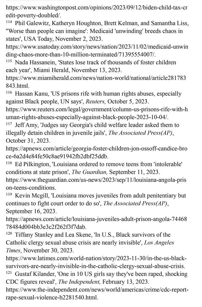少年司法系統(tǒng)中的兒童遭受不人道待遇。2023年10月,聯(lián)合國(guó)人權(quán)理事會(huì)在執(zhí)法工作中推進(jìn)種族正義和平等的國(guó)際獨(dú)立專家機(jī)制調(diào)查顯示,美國(guó)刑事司法系統(tǒng)充斥著某些特有的不人道做法。美國(guó)是世界上唯一一個(gè)判處兒童終身監(jiān)禁不得假釋的國(guó)家。(注116)在佐治亞州,兒童福利機(jī)構(gòu)的負(fù)責(zé)人要求法官將有精神問題和行為問題的兒童拘留在少年監(jiān)獄。(注117)自2022年10月以來,多達(dá)80名兒童被帶到路易斯安那州以暴力著稱的安哥拉監(jiān)獄,關(guān)押在死刑犯等待處決的牢房里。(注118)盡管這些兒童與成年囚犯隔離,但他們?cè)馐芰宋kU(xiǎn)的熱浪,長(zhǎng)時(shí)間被關(guān)在牢里,使用的是污水,更無法獲得教育。(注119)