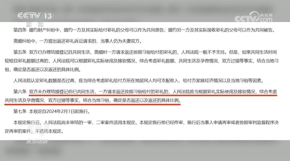 陜西省韓城市人民法院芝陽人民法庭庭長王春妮:“我們跟原告充分釋法明理,讓他知道咱們國家有新的規(guī)定,對他經(jīng)過反復(fù)做工作,他也降低了自己的心理預(yù)期。被告這邊認為我跟你在一起共同生活了,我也是實心想跟你過日子,但是因為沒有領(lǐng)證,而且我還跟你共同生育了一個孩子,你現(xiàn)在要求我給你返還彩禮,我就不愿意返還,心里有抵抗情緒。”