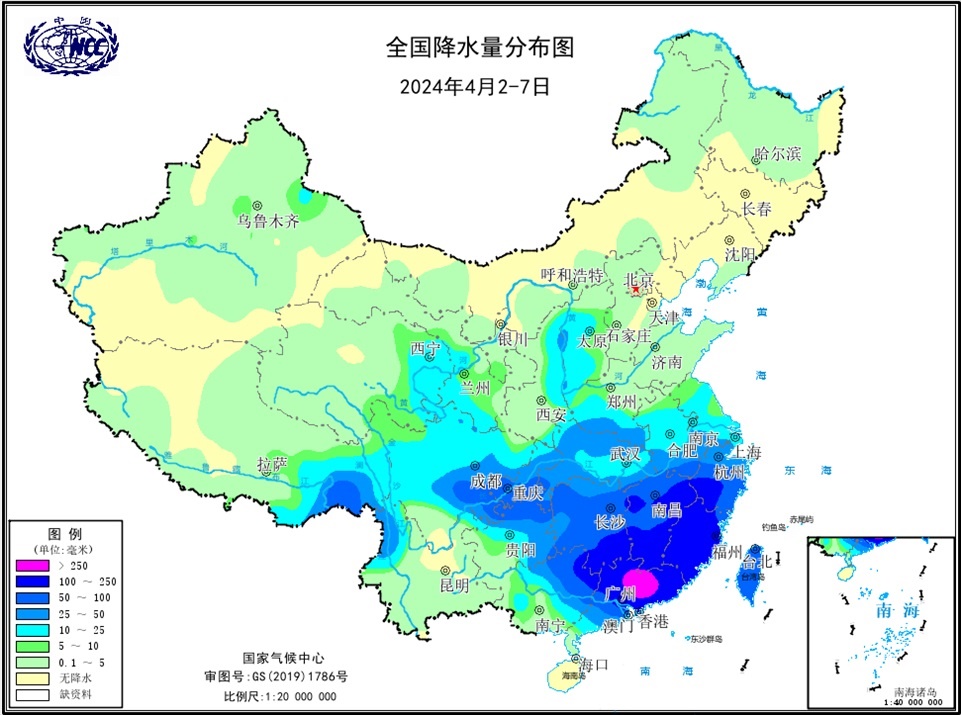 14次區(qū)域暴雨過程襲擊我國,較常年同期明顯偏多。春季,我國共發(fā)生14次區(qū)域暴雨過程,較常年同期偏多3.8次。4月2-7日的暴雨過程為1961年以來同期第八強(qiáng),受其影響,我國華東南部、華中南部、華南東部及貴州東北部、重慶、四川中東部等地累計(jì)降水量50~100毫米,浙江西南部、福建、江西南部、湖南東南部、廣東大部等地累計(jì)降水量100~250毫米,局地超過250毫米(圖5);湖南茶陵(203.2毫米)、廣東始興(145.3毫米)日降水量超過極端閾值。